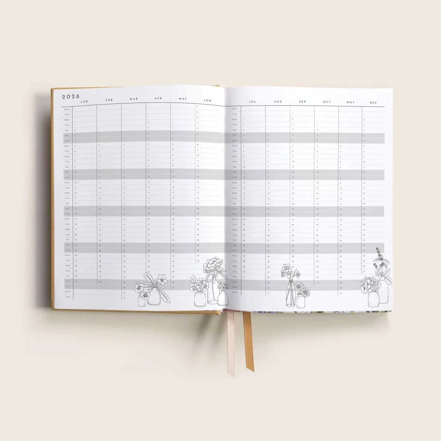 Weekly spreads for January through to December 2026 (with layout that has equal space for weekdays and Saturdays and Sundays)